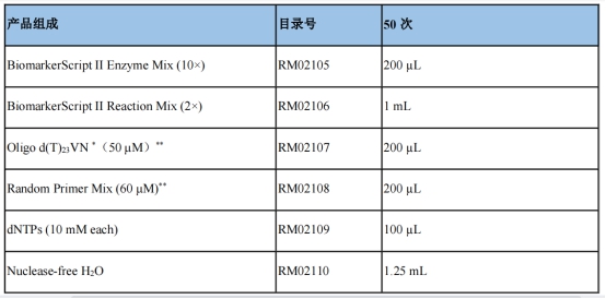 百邁客生物公司推出的一款BiomarkerScript II Enzyme Mix逆轉(zhuǎn)錄試劑盒,包含了BiomarkerScript II逆轉(zhuǎn)錄酶和RNase抑制劑