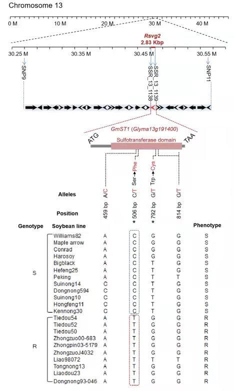 大豆[Glycine max(L.)Merr。]是一種在世界范圍內(nèi)種植的重要油料作物,是人類豐富的植物油和蛋白質(zhì)來源。但許多病原體優(yōu)先攻擊大豆。這些攻擊導(dǎo)致嚴重的產(chǎn)量損失和質(zhì)量下降。在全世界攻擊大豆的病原體中,大豆花葉病毒(SMV)是通過蚜蟲和感染的種子非持久性傳播的,是最廣泛和破壞性最大的疾病之一。SMV感染通常會使大豆產(chǎn)量降低10–30%,但在嚴重暴發(fā)時,損失可能達到50–100%。根據(jù)大豆品種中SMV感染的癥狀,包括典型的葉片圖案,葉片變形,植物發(fā)育不良,頂部壞死和種子斑點,將SMV菌株分為7種主要致病型:G1-G7。由于種子的可傳播性,所有主要大豆生產(chǎn)國都存在菌株致病型(G1-G7)。目前,有4個主要的SMV抗性基因座(Rsv1,Rsv3,Rsv4和Rsv5),大豆基因組的可用性加快了分子標記的開發(fā)和Rsv基因座候選基因的鑒定。最主要的Rsv1基因座是最復(fù)雜的,它包含編碼NBS-LRR蛋白的基因簇,這個染色體區(qū)域還攜帶多種病原體抗性基因,一大類同源NBS-LRR序列聚集在Rsv1基因座上,據(jù)推測,DNA的兩個片段分別是3gG2(Glyma.13g190800的等位基因)和5gG3(Glyma.13g190000的等位基因),是Rsv1的最可能的候選基因,針對Rsv3,Rsv4也進行了相關(guān)的研究。盡管針對每個Rsv基因座篩選了候選基因,但除了Rsv4以外,沒有一個關(guān)鍵基因被完全闡明。本研究中使用重組自交系RIL群體和F2分離群體,確定并精細繪制了SMV抗性基因座Rsvg2;分離候選基因的同時,使用表達分析和遺傳轉(zhuǎn)化測定法驗證了其功能。最終發(fā)現(xiàn),Rsvg2編碼磺基轉(zhuǎn)移酶(SOT),GmST1,與AtSOT15(AT5G07010)同源,為大豆對SMV的抗性提供了新的可能解釋。