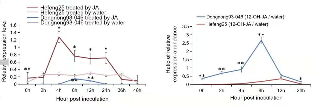 研究中為了證明在RSVG2-S等位基因和RSVG2-R等位基因之間,GmST1對SMV應(yīng)答的功能機制有所不同,且可能與JA信號通路相關(guān)(圖4),進一步關(guān)注了RSVG2-R等位基因攜帶者(Dongnong93-046與轉(zhuǎn)基因株系OE2-18)和RSVG2-S等位基因載體(Hefeng25)JA含量的轉(zhuǎn)錄本的變化,結(jié)果表明,內(nèi)源性JA對SMV G2菌株有響應(yīng),且響應(yīng)程度在GmST1的不同單倍型之間發(fā)生變化。最后基于RNA-seq數(shù)據(jù),通過轉(zhuǎn)基因與非轉(zhuǎn)基因植株的比對,對JA信號通路相關(guān)基因進行研究,結(jié)果表明,在SMV G2菌株感染下,JA的合成和代謝在RSVG2-R等位基因攜帶者中比在RSVG2-S等位基因攜帶者中更活躍,作為JA信號傳導(dǎo)途徑中的受體蛋白編碼基因,JAZ在具有不同GmST1等位基因的大豆品系之間具有差異表達,說明JA途徑是由SMV感染誘導(dǎo)的,且GmST1介導(dǎo)的SMV抗性可能取決于JA防御反應(yīng)。