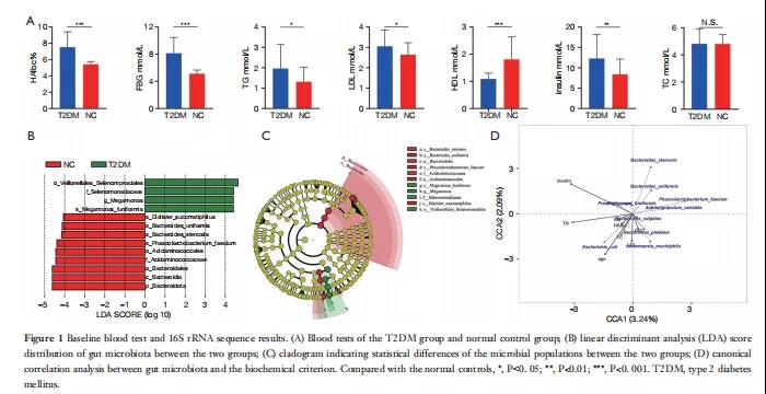 從測序的60個(gè)樣本中,共獲得514080個(gè)CCS序列。每個(gè)樣本產(chǎn)生至少428個(gè)CCS序列,平均8568個(gè)CCS序列。兩組的OTU數(shù)量、chao和ACE指數(shù)在統(tǒng)計(jì)學(xué)上存在顯著差異(分別為P=0.01、0.007和0.037),這表明T2DM可能引起腸道微生物多樣性的變化。Shannon和Simpson指數(shù)分析表明,測序深度足以捕獲所有細(xì)菌物種,樣本具有代表性。通過分析α多樣性和β多樣性,初步解釋了兩組間差異的構(gòu)成。在門水平上,厚壁菌、類桿菌、變形菌和放線菌是這兩組腸道微生物群的優(yōu)勢種,且比例相對(duì)較高。在正常對(duì)照組中,厚壁菌、類桿菌和變形菌分別占腸道微生物群的40.5%、45.1%和18.7%,而在T2DM組中,分別占47.4%、25.8%和21.4%。在T2DM組,類桿菌作為優(yōu)勢菌群的差異具有統(tǒng)計(jì)學(xué)意義(P=0.0049),類桿菌與厚壁菌的比例降低。LEfSe分析確定了兩組之間53種顯著不同的物種(生物標(biāo)記物篩選標(biāo)準(zhǔn):LDA評(píng)分>4,P<0.05)(圖1B,C)。不同腸道微生物群水平與基本指標(biāo)之間相關(guān)性的CCA典型相關(guān)分析結(jié)果如圖1D所示。