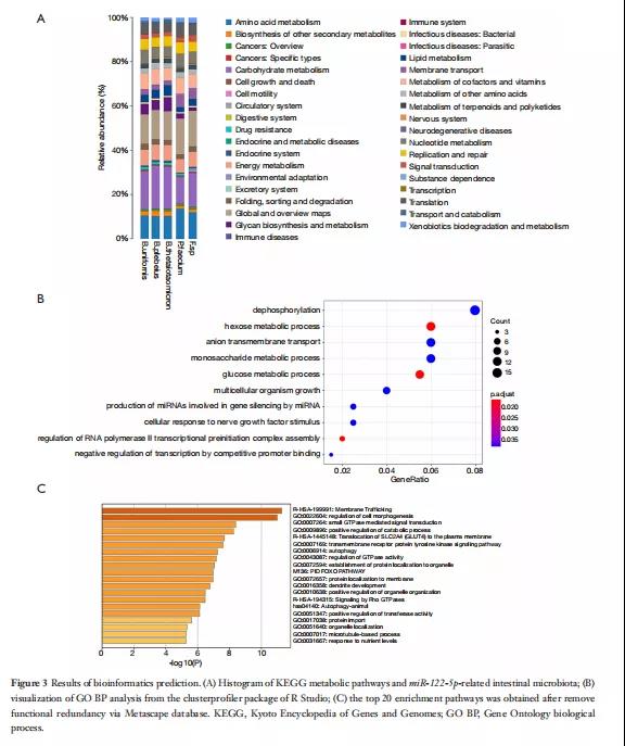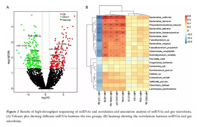 通過行Spearman相關(guān)分析。圖2B顯示了一個(gè)熱圖,描繪了五個(gè)與某些微生物區(qū)系具有統(tǒng)計(jì)顯著正相關(guān)和負(fù)相關(guān)的miRNA(P<0.05)。在這五種miRNA中,miR-122-5p在哺乳動(dòng)物的進(jìn)化過程中高度保守,與八種腸道細(xì)菌相關(guān),包括兩種腸道細(xì)菌B.uniformis和P.faecium,它們有顯著差異(分別為P=0.023和0.031)。