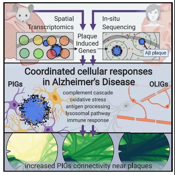 本研究利用空間轉錄組對AD小鼠模型中淀粉樣斑塊組織區(qū)域進行研究,發(fā)現了斑塊誘導的基因(PIGs)注釋到氧化應激和炎癥等相關通路上。此外通過對小鼠和人腦切片進行原位測序(ISS),證實了基因的變化。因此,空間轉錄組測序為探究AD相關腦部組織致病特征提供了可能。