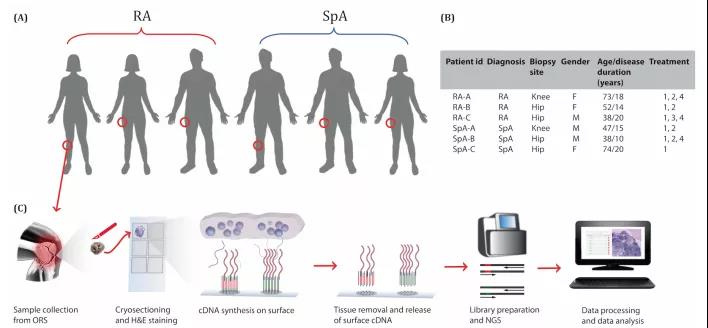 類風濕性關節(jié)炎(RA)和脊椎關節(jié)炎(SpA)是常見的慢性炎癥性疾病,其特征是關節(jié)發(fā)炎,兩種疾病中炎癥關節(jié)的特征是白細胞浸潤以及間充質細胞的局部增殖。臨床上,RA和SpA被認為是復雜的自身免疫性疾病。目前對炎癥通路的理解主要基于對滑液和滑膜活檢材料的研究,但它們都顯示出高度的細胞組成異質性,因此免疫組化(IHC)是活檢研究的changyong方法。然而,近年來轉錄組學已發(fā)展成為研究混合成分細胞調節(jié)分子途徑的一種更常見的方法,特別是單細胞轉錄組,這些方法雖然獲得的信息量大,但主要集中在來自同質化組織或單細胞懸浮液的細胞,并沒有揭示疾病病灶的空間信息。