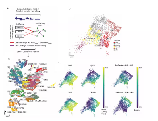 使用基因活性分?jǐn)?shù)來(lái)區(qū)分細(xì)胞類型,鑒定了多種主要的細(xì)胞類型,包括放射狀膠質(zhì)細(xì)胞(RGS)、中間前體細(xì)胞(IPC)、深層(皮質(zhì)V-VI層)興奮性神經(jīng)元(dlENs)、上層(皮質(zhì)II-IV層)興奮性神經(jīng)元(UlENs)、MGE和CGE來(lái)源的皮質(zhì)中間神經(jīng)元(分別為IN-MGES和IN-CGES)、胰島神經(jīng)元、MGE的前體細(xì)胞、小神經(jīng)膠質(zhì)細(xì)胞、少突膠質(zhì)前體細(xì)胞(OPCs)、內(nèi)皮細(xì)胞以及壁細(xì)胞。此外,結(jié)合scRNA-seq數(shù)據(jù),使用CellWalker將scATAC-seq細(xì)胞與細(xì)胞類型匹配。CellWalker以更精細(xì)的分辨率識(shí)別細(xì)胞類型和更廣泛的細(xì)胞亞型。此外,作者可以在兩種亞型(TRGS和ORGS)之間識(shí)別出不同的開放區(qū),這兩種亞型分別表達(dá)CRYAB和HOPX,這表明scATAC-seq能夠在高分辨率下區(qū)分細(xì)胞亞型,具有更高的靈敏度。