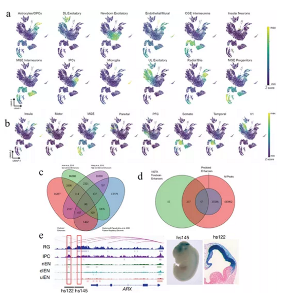 為了鑒定候選增強(qiáng)子,整合了ATAC-seq、CUT&Tag、Hic和基因表達(dá)數(shù)據(jù),并使用接觸活性算法來(lái)預(yù)測(cè)所有類型的皮質(zhì)細(xì)胞的增強(qiáng)子-基因相互作用。共預(yù)測(cè)了25,659個(gè)基因連鎖增強(qiáng)子。其中在發(fā)育中的人皮層分離的細(xì)胞上進(jìn)行了染色質(zhì)免疫沉淀和測(cè)序(PLAC-seq),發(fā)現(xiàn)了67,493個(gè)開放區(qū)以及10,050個(gè)預(yù)測(cè)的增強(qiáng)子,這些開放區(qū)和預(yù)測(cè)的增強(qiáng)子與預(yù)測(cè)的細(xì)胞類型特異性增強(qiáng)子相關(guān)的基因被富集。為了進(jìn)一步驗(yàn)證注釋的z確性,將開放區(qū)與從人類皮質(zhì)組織樣本生成的公開可用數(shù)據(jù)進(jìn)行關(guān)聯(lián)分析。發(fā)現(xiàn)scATAC-seq鑒定到了混合測(cè)序數(shù)據(jù)注釋的大多數(shù)開放區(qū),并且還鑒定了許多在混合數(shù)據(jù)中未預(yù)測(cè)的細(xì)胞類型特異性peaks,特別是富集在諸如小神經(jīng)膠質(zhì)細(xì)胞和內(nèi)皮細(xì)胞的稀有細(xì)胞群體中的開放區(qū)。在功能驗(yàn)證的前腦增強(qiáng)子中,大多數(shù)(319個(gè)中的304個(gè))與染色質(zhì)可及性開放區(qū)重疊,但只有67個(gè)重疊的增強(qiáng)子是通過(guò)激活接觸方法進(jìn)行預(yù)測(cè)??傊?,這些分析表明,scATAC-seq是一種從異質(zhì)組織樣本中檢測(cè)染色質(zhì)可及性模式的可靠方法。然而,預(yù)測(cè)的增強(qiáng)子與以前發(fā)表的研究的有限重疊表明,迫切需要更好地理解預(yù)測(cè)調(diào)控潛力的計(jì)算機(jī)算法的相關(guān)特征。