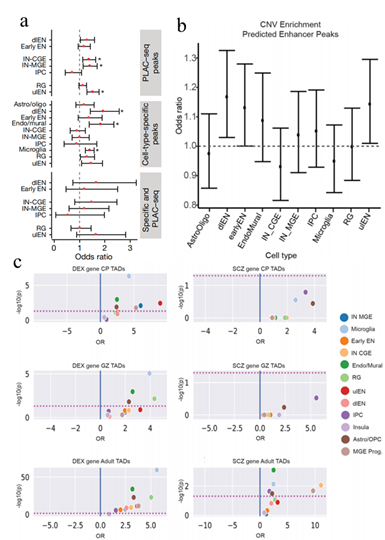 不同發(fā)育階段和分化狀態(tài)的染色質(zhì)狀態(tài)的細(xì)胞分辨率數(shù)據(jù)可能提供突變和發(fā)育中的不同細(xì)胞類型選擇性脆弱性之間的聯(lián)系。為此,研究者將特定細(xì)胞類型的ATAC-seq peaks和預(yù)測(cè)的增強(qiáng)子與疾病相關(guān)的常見和罕見的非編碼突變體記性關(guān)聯(lián)分析。首先分析了細(xì)胞類型特異性的peaks sets、預(yù)測(cè)的增強(qiáng)子、啟動(dòng)子相互作用區(qū)域與基因組區(qū)域重疊的peaks值,這些區(qū)域在發(fā)育遲緩的個(gè)體中富集了拷貝數(shù)變異;結(jié)果發(fā)現(xiàn)dlEN、內(nèi)皮/壁層和小神經(jīng)膠質(zhì)細(xì)胞特異性peaks顯著富集,以及中間神經(jīng)元中重疊啟動(dòng)子相互作用區(qū)的peaks顯著富集。
