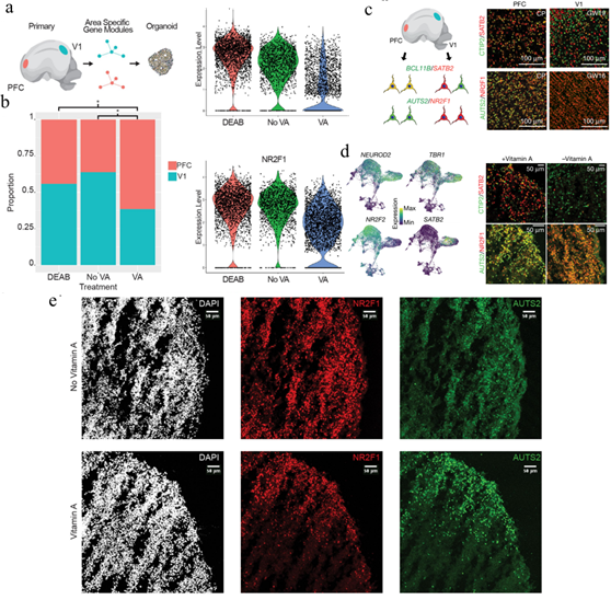 在哺乳動(dòng)物大腦發(fā)育的過(guò)程中,視黃酸信號(hào)在神經(jīng)組織中發(fā)揮著重要的作用。為了測(cè)試RA是否促進(jìn)人類PFC的分化,在含有或不含有維生素A(RA合成的前體)的情況下培養(yǎng)皮質(zhì)類器官。同時(shí)利用DEAB(一種有效的RA合成抑制劑)處理與維生素A一起培養(yǎng)的腦類器官。在分化的第10周,此時(shí)深層神經(jīng)正在發(fā)生,利用scRNA-seq分析了腦類器官。發(fā)現(xiàn)在維生素A存在下培養(yǎng)的興奮性前腦神經(jīng)元與不含維生素A或在DEAB存在下培養(yǎng)的腦類器官的神經(jīng)元是分開聚類的。還發(fā)現(xiàn)了區(qū)分PFC和V1皮層神經(jīng)元的信號(hào)。利用目前的分類方法注釋類器官神經(jīng)元中的PFC和V1神經(jīng)元的特征;與未使用維生素A培養(yǎng)或使用DEAB處理的神經(jīng)元相比,維生素A培養(yǎng)的類器官中PFC類似神經(jīng)元的比例始終較高。免疫染色證實(shí)了基因產(chǎn)物的差異表達(dá),并發(fā)現(xiàn)與含有維生素A培養(yǎng)的腦類器官的PFC特性一致。這些發(fā)現(xiàn)表明,RA信號(hào)通路有助于人類皮質(zhì)發(fā)育過(guò)程中PFC神經(jīng)元譜系的發(fā)育。
