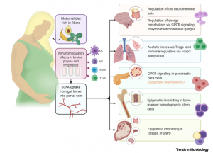 圖1.短鏈脂肪酸(SCFA)對腸道以外的器官和組織的影響,包括發(fā)育中的胎兒。富含不可消化纖維的飲食可促進(jìn)微生物發(fā)酵和結(jié)腸中SCFA的產(chǎn)生,從而通過直接作用于腸道上皮細(xì)胞和免疫細(xì)胞來促進(jìn)粘膜動態(tài)平衡。[2]