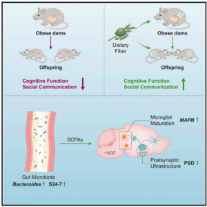親肥胖與兒童認(rèn)知和社交能力低下密切相關(guān)。此外,已經(jīng)證明,母親肥胖會破壞后代的行為和腸道微生物群,母鼠或后代的高纖維飲食通過減輕突觸損傷和小膠質(zhì)細(xì)胞成熟缺陷恢復(fù)了這兩種行為和腸道微生物群。共同居住和糞便微生物群移植實(shí)驗(yàn)揭示了微生物群與行為變化之間的因果關(guān)系。此外,用微生物群衍生的短鏈脂肪酸治療也減輕了肥胖母鼠后代的行為缺陷??傊?,研究表明,微生物群代謝物腦軸可能是母親肥胖引起的認(rèn)知和社會功能障礙的基礎(chǔ),高膳食纖維攝入可能是一種有希望的干預(yù)措施。