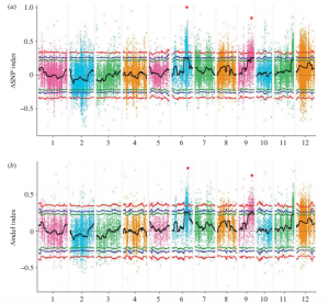 本研究在Longjiang25(耐冷)和Longjiang11(不耐冷)雜交構(gòu)建的F2群體中(245份材料),挑選50個(gè)耐冷和50個(gè)不耐冷極端材料分別進(jìn)行混池測(cè)序,親本各10×,子代分別是67×和80×,進(jìn)行BSA分析;利用SNP index 和indel index方法進(jìn)行性狀與標(biāo)記的關(guān)聯(lián),最終將候選區(qū)域定位到6號(hào)染色體和9號(hào)染色體上的0.82Mb區(qū)域內(nèi),分析發(fā)現(xiàn)這些區(qū)域共包含98個(gè)注釋基因。