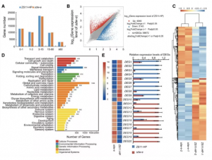 作者對(duì)低溫脅迫(12℃)條件下,對(duì)第0、2、4天水稻花序上3.5-4.5mm的幼穗進(jìn)行取樣, 做 RNA-seq分析 ,分析兩親本在低溫脅迫條件下,差異基因表達(dá)情況。結(jié)合BSA關(guān)聯(lián)分析的定位區(qū)間,發(fā)現(xiàn)候選區(qū)域內(nèi)有50個(gè)差異表達(dá)基因。通過(guò)對(duì)差異表達(dá)基因進(jìn)行GO和KEGG富集功能分析結(jié)合功能富集分析,確定4個(gè)(Os09g0514200、Os09g0516500、Os09g0516600和Os09g0511600)潛在候選基因與耐寒性相關(guān);進(jìn)一步通過(guò)qRT-PCR驗(yàn)證這4個(gè)基因的表達(dá)情況,結(jié)果顯示與轉(zhuǎn)錄組表達(dá)一致。