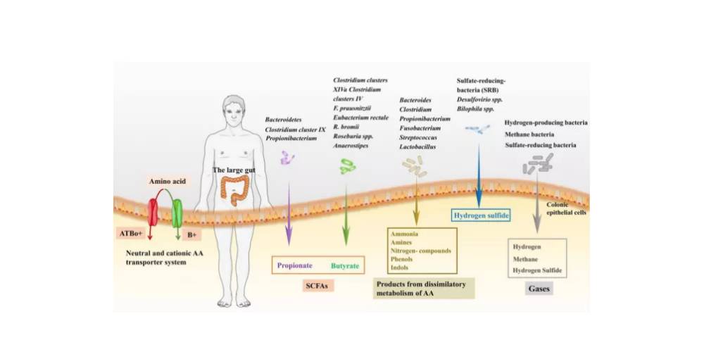 氨基酸(Amino Acids,AAs)是人體必需的物質(zhì),它不僅是蛋白質(zhì)合成的原材料,還可以參與微生物代謝。人體獲取氨基酸不僅可以通過腸道吸收,還可以由微生物代謝產(chǎn)生。不僅如此,氨基酸組成和豐度的變化可影響代謝細(xì)菌群落,并通過TLR受體、NLR受體等調(diào)節(jié)巨噬細(xì)胞和樹突狀細(xì)胞,還可通過AhR受體、5-HT調(diào)節(jié)腸道微生物免疫軸,以及其他信號(hào)通路,所有這些通路在直接或間接調(diào)節(jié)腸粘膜免疫和微生物群方面起著關(guān)鍵作用,有助于腸道內(nèi)環(huán)境平衡。[1]