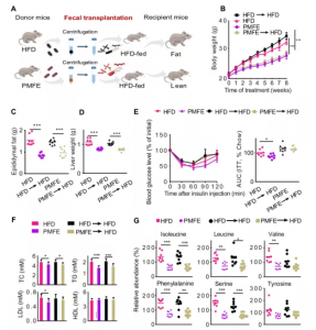 圖4.柑橘PMFE糞便移植對(duì)HFD小鼠具有代謝保護(hù)作用