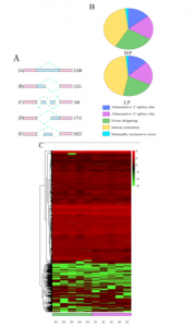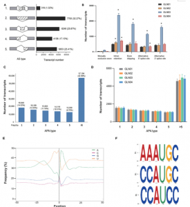 APA和AS的鑒定增強了我們對轉(zhuǎn)錄異構體多樣性生物學作用的理解。在本研究中,確定了9035例AS事件,并將其分為五類(圖2)。在檢測到的全部轉(zhuǎn)錄本中,有6.86%由某種可變剪切形式產(chǎn)生,其中內(nèi)含子保留是最常見的可變剪切事件。此外,在88092個基因位點上進一步確定了207955個APA事件。