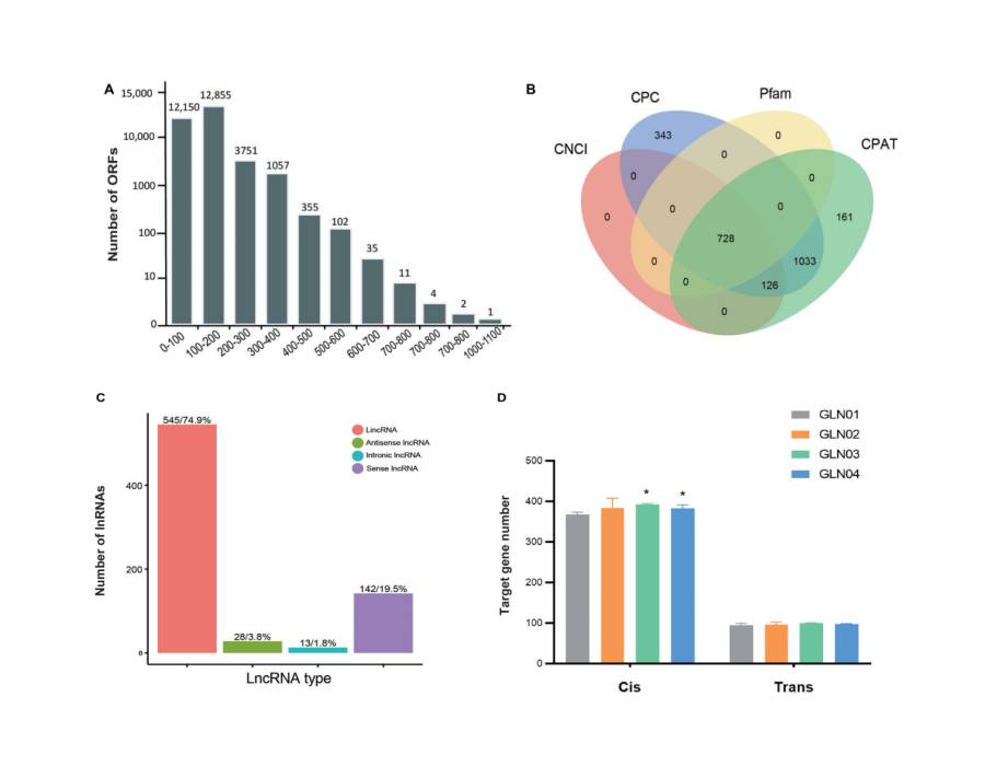 總共鑒定了38108個ORF,包括30323個(79.57%)完整的ORF,它們同時具有起始密碼子和終止密碼子。就完整的ORF而言,100-200 bp(12855個ORF)、0-100 bp(12150個)和200-300 bp(3751個)長度所占比例最大(圖3A)。共鑒定出728個lncRNAs,平均長度在298到4362 nt之間。這些lncRNAs進一步分類為545個基因間區(qū)lncRNAs(74.86%)、28個反義lncRNAs(3.85%)、13個內(nèi)含子lncRNAs(1.79%)和142個正義lncRNAs(19.50%)(圖3C)。研究還發(fā)現(xiàn),這些lncRNAs調(diào)控的順式靶基因比那些反式靶基因多(圖3D)。發(fā)現(xiàn)在GLN01和GLN03之間(Student t檢驗,p=0.002),以及GLN01和GLN04之間(p=0.037),這些lncRNAs調(diào)控的順式靶基因顯著增加,而這些lncRNAs調(diào)控的反式靶基因在整個莖發(fā)育過程中未發(fā)現(xiàn)顯著變化。