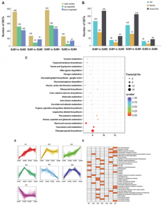 結果顯示GLN01和GLN04之間有492個DET,其中283個上調(diào),209個下調(diào)(圖5A)。接著是GLN01和GLN02,GLN01和GLN03,分別有468個和136個。富集分析結果顯示,GLN01和GLN04之間的DET在三條KEGG途徑:“苯丙烷生物合成”(16個DET)、“淀粉和蔗糖代謝”(10個DET)和“氰基氨基酸代謝”(8個DET)中顯著富集(圖5C)。