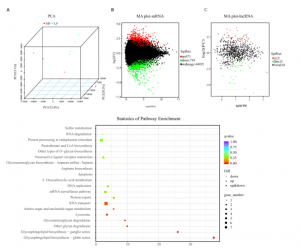 共鑒定出1390個mRNAs(671個上調(diào),719個下調(diào))和50個lncRNAs(22個上調(diào),28個下調(diào))(圖4B和C)。在本研究中,預測DE-lncRNAs與其靶mRNA協(xié)同發(fā)揮其功能,從而說明珊瑚對環(huán)境變化的適應。對lncRNA靶向mRNAs進行KEGG富集分析,以探索鹿角珊瑚lncRNAs的功能。根據(jù)KEGG分析,DE-lncRNA靶向mRNA在五條途徑中顯著富集(q值<0.05),如ko00603鞘糖脂生物合成-球狀系列、ko00531氨基糖降解、ko00604鞘糖脂生物合成-神經(jīng)節(jié)苷脂系列、ko00511其他聚糖降解、ko04142溶酶體、,ko00520氨基糖和核苷酸糖代謝,以及ko03013 RNA轉(zhuǎn)運。