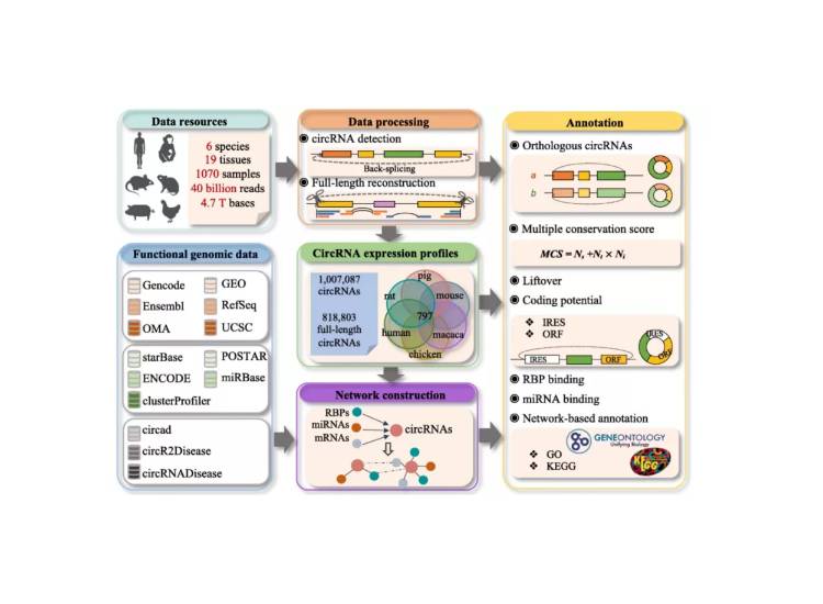 現(xiàn)有的環(huán)狀RNA (circRNA)數(shù)據(jù)庫已經(jīng)成為轉(zhuǎn)錄組學的基礎(chǔ)。但是目前常用的方法對于深度挖掘候選circRNA仍有限?;谶@種情況,趙方慶教授團隊2020年在genome biology雜志發(fā)表了circAtlas數(shù)據(jù)庫的文章(CircAtlas: an integrated resource of one million highly accurate circular RNAs from 1070 vertebrate transcriptomes)。circAtlas數(shù)據(jù)庫基于從六個脊椎動物物種(人類,獼猴,小鼠,大鼠,豬和雞)的19個正常組織中收集的1070個RNA-seq樣本數(shù)據(jù)匯總了環(huán)狀RNA相關(guān)信息。該數(shù)據(jù)庫包含1,007,087個高度可靠的circRNA,其中81.3%以上已被組裝成全長序列。數(shù)據(jù)庫終不僅概述了它們的表達模式、保守性和功能注釋等信息,還描述了一種新的多重保護評分、共表達和調(diào)控網(wǎng)絡(luò),用于circRNA注釋和排序。