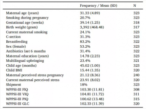 380個樣本中有364個成功進行了微生物菌群分析(圖1)。在隨后的統(tǒng)計分析中,排除了一名孕齡較晚的受試者、35名WPPSI-III量表測試方法不準(zhǔn)確的受試者以及5名運輸/儲存不規(guī)范的受試者,共323名受試者。對于其余的家庭,記錄人口統(tǒng)計資料(母親年齡、兒童年齡、性別),產(chǎn)前、產(chǎn)期和產(chǎn)后因素(胎齡、出生體重、吸煙情況、剖腹產(chǎn)、母乳喂養(yǎng)、母親教育、多語言教育、兒童的BMI、抗生素使用情況)以及認知水平(WPSSI-III 總智商(FIQ),言語智商(VIQ)、操作智商(PIQ)和通用語言組合(GLC))(表1)。