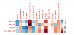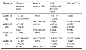 阿爾法多樣性指標(biāo)與認知水平之間存在顯著負相關(guān)。如表3所示,F(xiàn)aith系統(tǒng)發(fā)育多樣性指數(shù)與WPPSI-III FIQ之間的顯著關(guān)聯(lián)。同時發(fā)現(xiàn)抗生素的使用與Shannon多樣性指數(shù)和Pileou均勻度呈負相關(guān),妊娠期與Shannon多樣性指數(shù)和觀測到的物種數(shù)呈負相關(guān),以及C-section與Faith的系統(tǒng)發(fā)育多樣性指數(shù)呈現(xiàn)正相關(guān)(圖S1)。