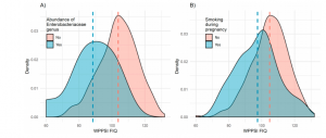 隨后對腸桿菌科內(nèi)的未知屬進行了另外的分析,發(fā)現(xiàn)與母親年齡和吸煙與否幾個協(xié)變量是相關(guān)的。尤其是和孕婦在懷孕期間吸煙和T4時期吸煙(圖3B)相關(guān)性更為明顯。中介分析(圖3)表明腸桿菌科中該屬介導(dǎo)了孕婦妊娠期間吸煙和當(dāng)前吸煙對WPPSI-III FIQ的影響。