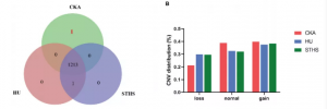 (1)例如,在416個(gè)奶山羊中鑒定得到了7,208個(gè)CNVs,GWAS分析發(fā)現(xiàn)31個(gè)CNVs所在區(qū)域與產(chǎn)奶量等性狀顯著相關(guān),并且發(fā)現(xiàn)在顯著相關(guān)的CNVs中,注釋的基因大多數(shù)在產(chǎn)奶相關(guān)的生物過程和健康相關(guān)性狀中發(fā)揮著重要作用。在另一個(gè)研究中,利用新開發(fā)的GWAScore方法整合已發(fā)表的GWAS數(shù)據(jù)來(lái)鑒定潛在的候選位點(diǎn),并對(duì)3個(gè)不同品種(CKA,n=10、HU,n=10、STHS,n=9)山羊進(jìn)行全基因組CNVs檢測(cè)(圖3),通過將CNVs與GWAScore和QTL位點(diǎn)相整合,發(fā)現(xiàn)197個(gè)候選基因與CNVs存在重疊,進(jìn)一步鑒定得到28個(gè)與生長(zhǎng)性狀相關(guān)的CNVs。