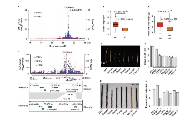 (2)在除水稻以外的作物中也有使用SVs進(jìn)行GWAS的報(bào)道。例如,在玉米中,521個(gè)自交系玉米基因組序列中的SVs被用于繪制玉米SV圖譜;在小麥中發(fā)現(xiàn)了影響染色體3B上基因和轉(zhuǎn)座元件的SV;在最近的一項(xiàng)木瓜研究中(使用栽培木瓜和野生木瓜),共鑒定出8083個(gè)SVs,其中包括5260個(gè)缺失,552個(gè)串聯(lián)重復(fù)和2271個(gè)插入,在該研究中,還發(fā)現(xiàn)CNVs與生長(zhǎng)和對(duì)環(huán)境壓力的反應(yīng)有關(guān);在油菜中,基于鑒定得到的數(shù)百萬(wàn)SVs和PAVs用于PAV-GWAS,直接鑒定到了莢果長(zhǎng)度、種子重量和開花時(shí)間相關(guān)的結(jié)構(gòu)變異,這些是之前基于單核苷酸變異SNP進(jìn)行的GWAS所沒能鑒定出來(lái)的,充分說(shuō)明了PAV-GWAS可以互補(bǔ)于SNP-GWAS用來(lái)鑒定特定性狀相關(guān)的位點(diǎn)(圖7);另外,其他植物SVs鑒定例子包括:溝酸漿屬的耐鹽性、葡萄的漿果顏色和番茄的馴化性狀等研究。