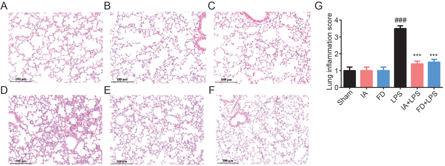 圖1.A~F:六組小鼠肺部組織H&E染色顯微鏡圖片,G:六組小鼠肺部損傷的量化評(píng)分