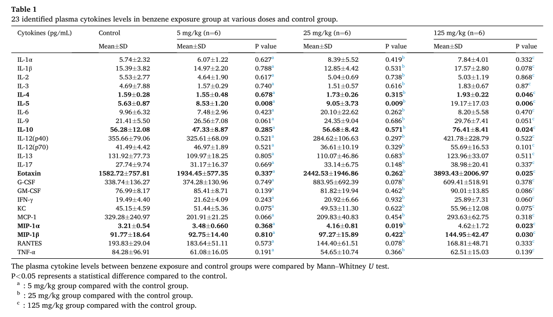 表一.測(cè)定不同劑量苯暴露組和對(duì)照組23種血漿細(xì)胞因子水平