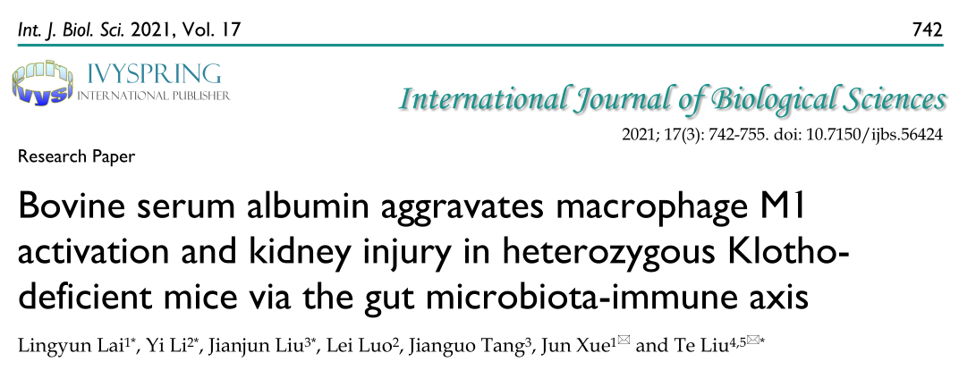 1. Lai L, Li Y, Liu J, et al. Bovine serum albumin aggravates macrophage M1 activation and kidney injury in heterozygous Klotho-deficient mice via the gut microbiota-immune axis[J]. International journal of biological sciences, 2021, 17(3): 742.