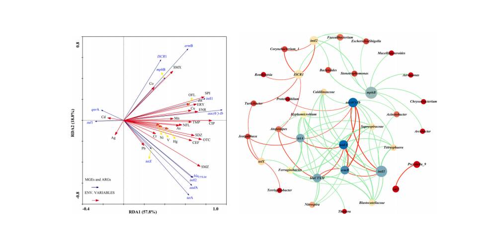 抗生素耐藥性是影響生態(tài)系統(tǒng)健康和公共衛(wèi)生的一個(gè)日益嚴(yán)重的問(wèn)題。該研究在中國(guó)新鄉(xiāng)16個(gè)采樣點(diǎn)調(diào)查了9個(gè)耐藥基因(ARGs)和3個(gè)移動(dòng)遺傳元件(MGEs)及其與抗生素、重金屬和微生物群的關(guān)系。醫(yī)院排出物中氟喹諾酮類(fluoroquinolones)含量最高,動(dòng)物糞便中土霉素(oxytetracycline)含量最高。動(dòng)物糞便中鋅和銅含量最高,可能影響intI1和aac(6’)-Ib基因的擴(kuò)散。氨基糖苷類和磺胺類耐藥基因(aac(6 ‘)-Ib、aadA和sul1)是該地區(qū)主要ARGs。此外,除sul1基因外,動(dòng)物糞便中ARGs和MGEs的檢出量均高于醫(yī)院污水。另一方面,污水處理廠(MWWTPs)中抗生素(29.76-100%)、重金屬(31.25-100%)和ARGs(1-3個(gè)數(shù)量級(jí))的不完全去除導(dǎo)致這些污染物在下游河流中積累。網(wǎng)絡(luò)分析表明,ARG的潛在宿主(Jeotgalibaca、Atopostipes、Corynebacterium_1等)在動(dòng)物糞便中比在醫(yī)院污水中更占優(yōu)勢(shì),表明與醫(yī)院污水相比,ARG在動(dòng)物糞便中的轉(zhuǎn)移潛力更高。這些結(jié)果為抗生素、重金屬、ARGs和微生物從人類和動(dòng)物源通過(guò)MWWTP排放和施肥向接收環(huán)境的不同遷移和傳播途徑提供了有用的見(jiàn)解。