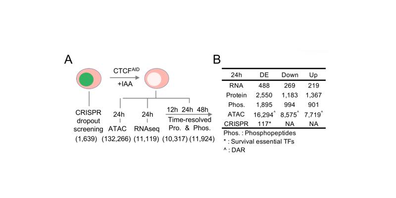 CCCTC-結合因子(CTCF)是一種高度保守的含鋅指轉錄因子,被稱為“基因組編織大師”。它是研究最廣泛的三維(3D)染色質結構調控因子。研究發(fā)現(xiàn)在CTCF急性衰竭細胞模型和其他基因敲除模型中,CTCF在全基因組TAD和TAD內部loop環(huán)的形成中是不可或缺的。為了更好地理解CTCF結合占用率如何促進轉錄調控,本文系統(tǒng)地進行了多組學研究,特別關注染色質可及性。通過系統(tǒng)整合了ATAC-seq、RNA-seq, WGBS, Hi-C, Cut&Run和CRISPR-Cas9基因篩選技術,以及深度蛋白質組學和磷酸化蛋白質組學分析,用以研究CTCF蛋白急性耗竭對細胞的影響。
