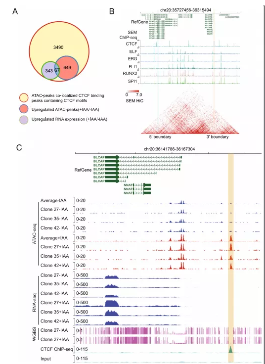 本文通過綜合分析建立了一個框架來識別假定的CTCF介導的絕緣子元件。將ATAC-seq結果中的3490個峰和有CTCF結合的峰取交集,共有716個增強的ATAC-seq峰。接下來,將它們與RNA-seq結果中上調的基因進行比對,判斷TSSs是否位于距離DARs區(qū)域2-50 kb的范圍。綜上所述,有67個基因符合這些標準(圖(Fig 4A)。這67個基因中有20個基因的附近有染色質loop環(huán)。例如,在BLCAP基因上游約7 kb處觀察到一個假定的抑制性CTCF結合峰,該峰位于Hi-C數(shù)據所示的染色質絕緣loop環(huán)中(圖4B )。在未經過IAA處理的對照CTCFAID細胞中,CTCF與該motif結合導致染色質可及性受到抑制,這在ATAC-seq數(shù)據中信號的缺失很明顯。然而,在急性CTCF耗竭時,ATAC-seq峰值信號和BLCAP mRNA表達明顯增加(圖4C)。