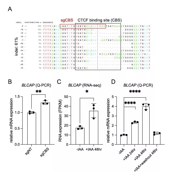 為了進一步驗證預測的假定絕緣子的作用,將慢病毒表達的引導RNA感染表達Cas9的SEM細胞中,然后進行抗生素選擇。Sanger基因組測序(Inference of CRISPR edit, ICE)在目標人群中檢測到約61%的總indel頻率(圖5A),與非靶向導向對照組(sgNT)相比,導致BLCAP mRNA表達顯著增加(圖5B)。用IAA處理CTCFAID細胞24和48小時,然后洗脫IAA進行CTCF修復。通過RNA-seq分析和Q-PCR驗證,驗證急性CTCF蛋白耗竭時BLCAP mRNA的表達(圖5C)。不出所料,生長素處理24或48 h后CTCF蛋白急性耗竭,BLCAP表達水平顯著升高。更重要的是,洗脫生長素后,其表達水平恢復到親本細胞的水平(圖5D)。綜上所述,這些數(shù)據有力地支持了CTCF在BLCAP調控區(qū)域的占用充當了控制BLCAP表達的功能絕緣體。