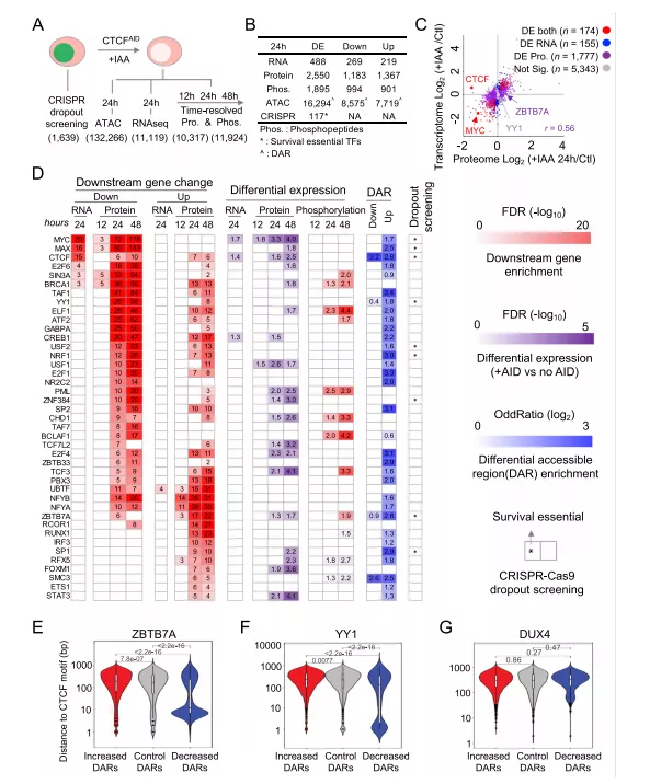 本文開發(fā)了一種多組學聯(lián)合的方法來定義CTCF共調控轉錄因子,總共鑒定了40個CTCF共同調控因子,這些TF在急性CTCF耗竭時在mRNA和/或蛋白質水平上顯著影響其下游靶基因的表達(圖6D)。正如預期的那樣,這40個CTCF共調控因子中的大多數(shù)也在CTCF介導的DARs中有共同定位,證實了它們與CTCF有著潛在的直接共同調控作用。