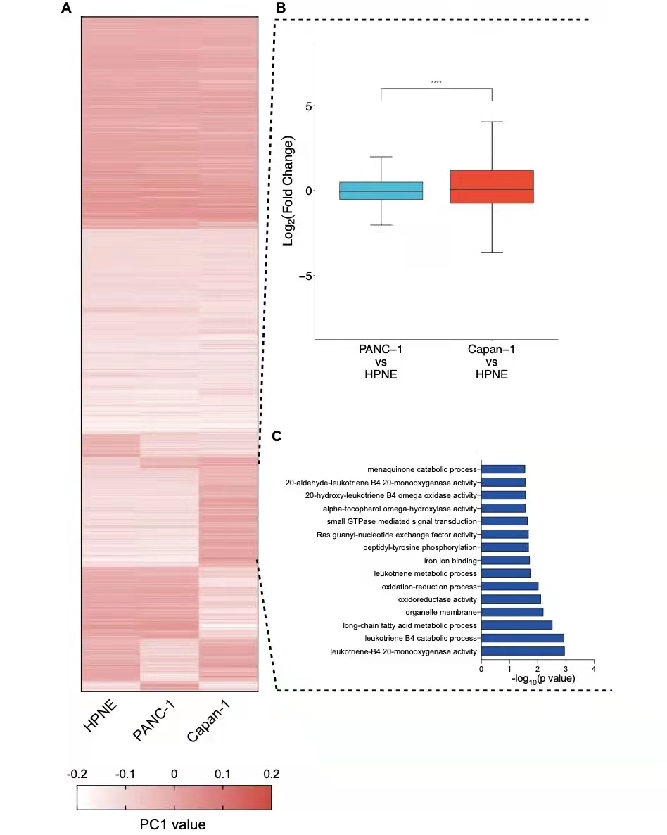 作者對(duì)Compartment利用PC1值進(jìn)行聚類分析,以確定正常和原發(fā)癌細(xì)胞的B區(qū)室轉(zhuǎn)變?yōu)檗D(zhuǎn)移癌細(xì)胞的A區(qū)室(圖1a),并且位于這些區(qū)室中的基因表現(xiàn)出更高的表達(dá)(圖1b)。GO富集分析結(jié)果顯示,這些基因富含Ras/small GTPase 、 oxidation–reduction term,而這些是胰腺癌進(jìn)展所必需的。這些結(jié)果提示,Compartment重排可能促進(jìn)胰腺癌的轉(zhuǎn)移。