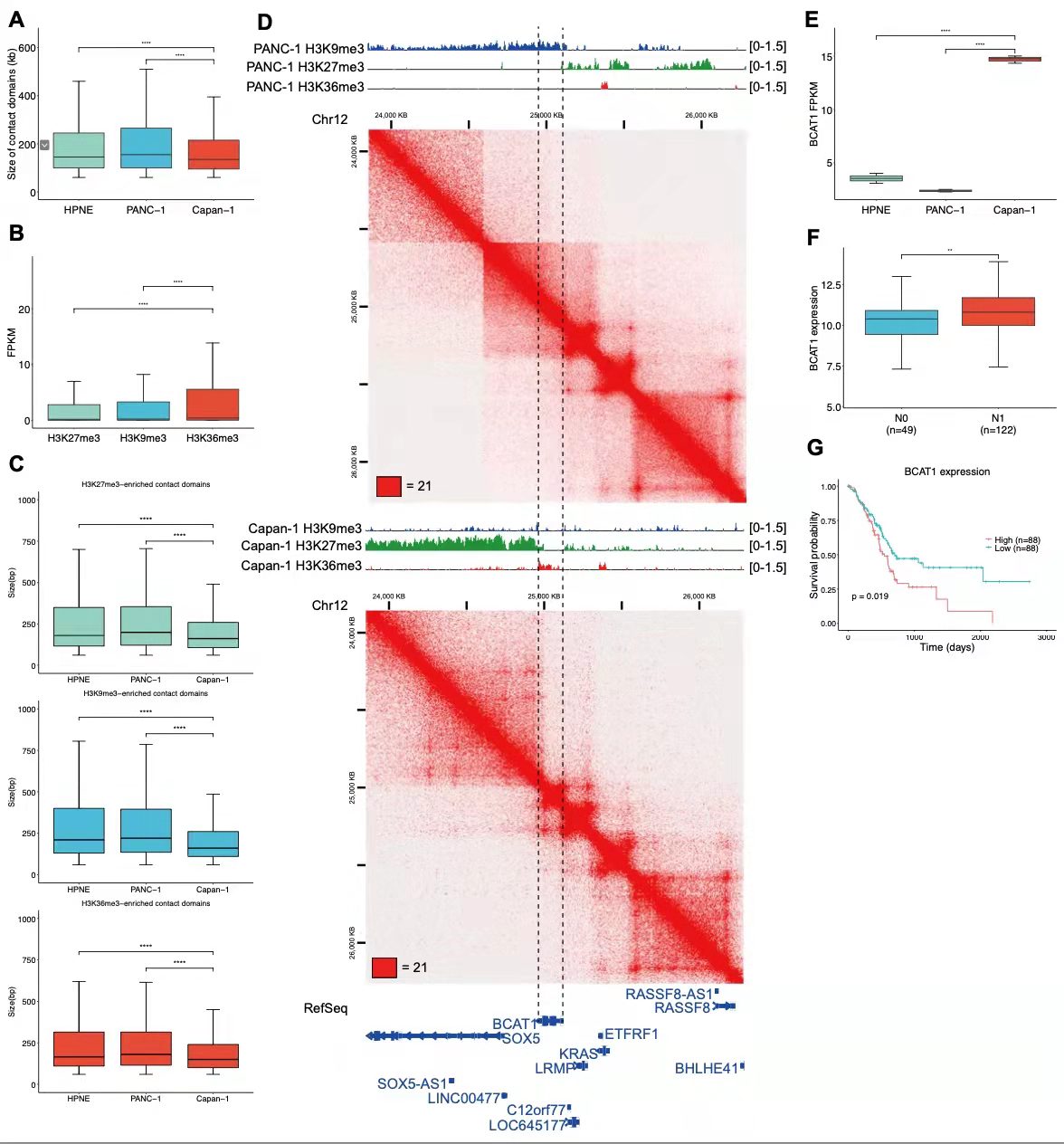通過Chip數(shù)據(jù)分析,與轉(zhuǎn)移癌相比,原發(fā)癌具有更高的H3K27me3富集的特異性TAD,表明轉(zhuǎn)移過程中,非活性的TAD轉(zhuǎn)變?yōu)榛钚缘腡AD。例如BCAT1基因,是重新編程支鏈氨基酸代謝所必需的,位于新的富含H3K36me3的TAD中(圖2d),并且其表達(dá)量顯著升高升高(圖2e)。根據(jù)TCGA數(shù)據(jù)集顯示,BCAT1在有淋巴結(jié)轉(zhuǎn)移的胰腺癌樣本中BCAT1表達(dá)上調(diào)(圖2f)(p=0.02,Student t檢驗(yàn)),并且BCAT1表達(dá)與總生存率呈負(fù)相關(guān)(圖2g)(p=0.028,對(duì)數(shù)秩檢驗(yàn))??傊@些結(jié)果表明,在胰腺癌轉(zhuǎn)移過程中,結(jié)構(gòu)域的分裂可能與表觀遺傳狀態(tài)的改變相結(jié)合。