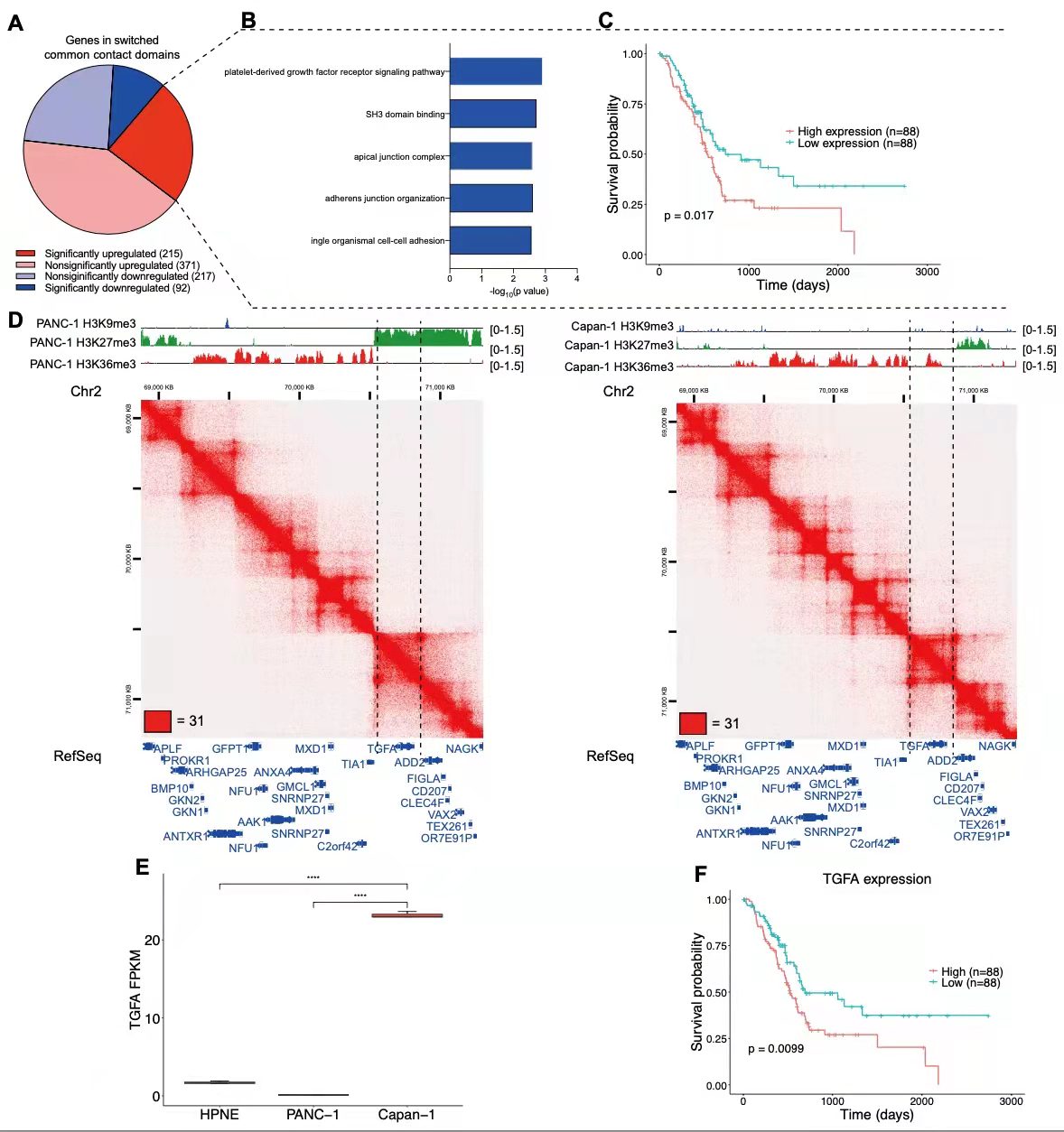 接下來,作者重點(diǎn)關(guān)注原發(fā)性和轉(zhuǎn)移性癌細(xì)胞之間的共同結(jié)構(gòu)域。提取了位于共同結(jié)構(gòu)域中的基因,發(fā)現(xiàn)這些基因中的大多數(shù)在轉(zhuǎn)移癌樣本中上調(diào),并且GO分析顯示顯著上調(diào)的基因(log2FC≥ 1和調(diào)整p值≤ 0.05)在血小板衍生生長因子受體信號(hào)通路中富集(圖3b)。此外,作者利用TCGA胰腺癌患者隊(duì)列的基因表達(dá)數(shù)據(jù)和長期隨訪數(shù)據(jù)來確定這些基因的表達(dá)與患者生存率之間的相關(guān)性。分析表明,這些基因的高表達(dá)顯著降低了患者的生存率(p=0.0175,對(duì)數(shù)秩檢驗(yàn))(圖3c)。例如,TGFA基因,位于原發(fā)癌富集H3K27me3的結(jié)構(gòu)域中,但位于轉(zhuǎn)移癌的富集H3K36me3的結(jié)構(gòu)域中。而這個(gè)基因的高表達(dá)顯著降低了患者的生存周期(圖3f)。也就是說,共同結(jié)構(gòu)域中的染色質(zhì)狀態(tài)改變也可促進(jìn)胰腺癌轉(zhuǎn)移。