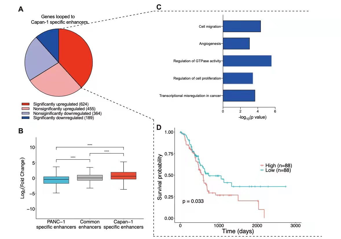通過loop環(huán)的分析,loop數(shù)量與TAD總體趨勢(shì)類似,在轉(zhuǎn)移細(xì)胞癌中顯著增加。與原發(fā)癌細(xì)胞相比,大多數(shù)啟動(dòng)子與Capan-1特異性增強(qiáng)子成環(huán)的基因表達(dá)上調(diào),同時(shí),這些基因的表達(dá)水平明顯高于與PANC-1特異性增強(qiáng)子連接的基因。作者對(duì)顯著上調(diào)基因富集分析發(fā)現(xiàn):這些基因在細(xì)胞遷移和血管生成方面顯著富集(圖4c),表明這些基因與胰腺癌轉(zhuǎn)移相關(guān);而且生存分析發(fā)現(xiàn),這些基因的高表達(dá)與不良預(yù)后顯著相關(guān)(圖4d)。這些結(jié)果表明,胰腺癌轉(zhuǎn)移過程中環(huán)的變化可上調(diào)轉(zhuǎn)移相關(guān)基因。