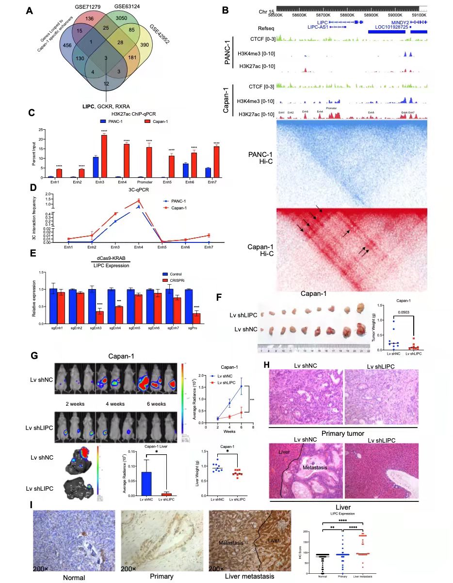 利用高分辨率Hi-C數(shù)據(jù),作者篩選了了600多個(gè)與胰腺癌轉(zhuǎn)移相關(guān)的環(huán)重編程基因。結(jié)合GEO數(shù)據(jù),定了3個(gè)交叉的關(guān)鍵基因,它們與Capan-1特異性增強(qiáng)子形成環(huán),并在胰腺癌轉(zhuǎn)移組織中上調(diào)(圖5a)。作者重點(diǎn)關(guān)注脂肪酶C(LIPC)基因,其在所有對(duì)照組中的FC變化最大(Capan-1與PANC-1中為11.44,GSE71279中為1.54,GSE63124中為7.96,GSE42952中為4.34)。H3K27ac芯片序列分析顯示有7個(gè)候選增強(qiáng)子位于LIPC基因座旁。這些增強(qiáng)子與Capan-1中的LIPC基因環(huán)接,但不與PANC-1中的LIPC基因環(huán)接(圖5b),導(dǎo)致Capan-1中LIPC的表達(dá)升高。qPCR結(jié)果顯示,Capan-1中所有候選增強(qiáng)子和LIPC啟動(dòng)子的表達(dá)水平升高(圖5c)。此外,3C qPCR檢測(cè)到Capan-1中LIPC啟動(dòng)子和增強(qiáng)子之間有更強(qiáng)的相互作用(圖5d)。