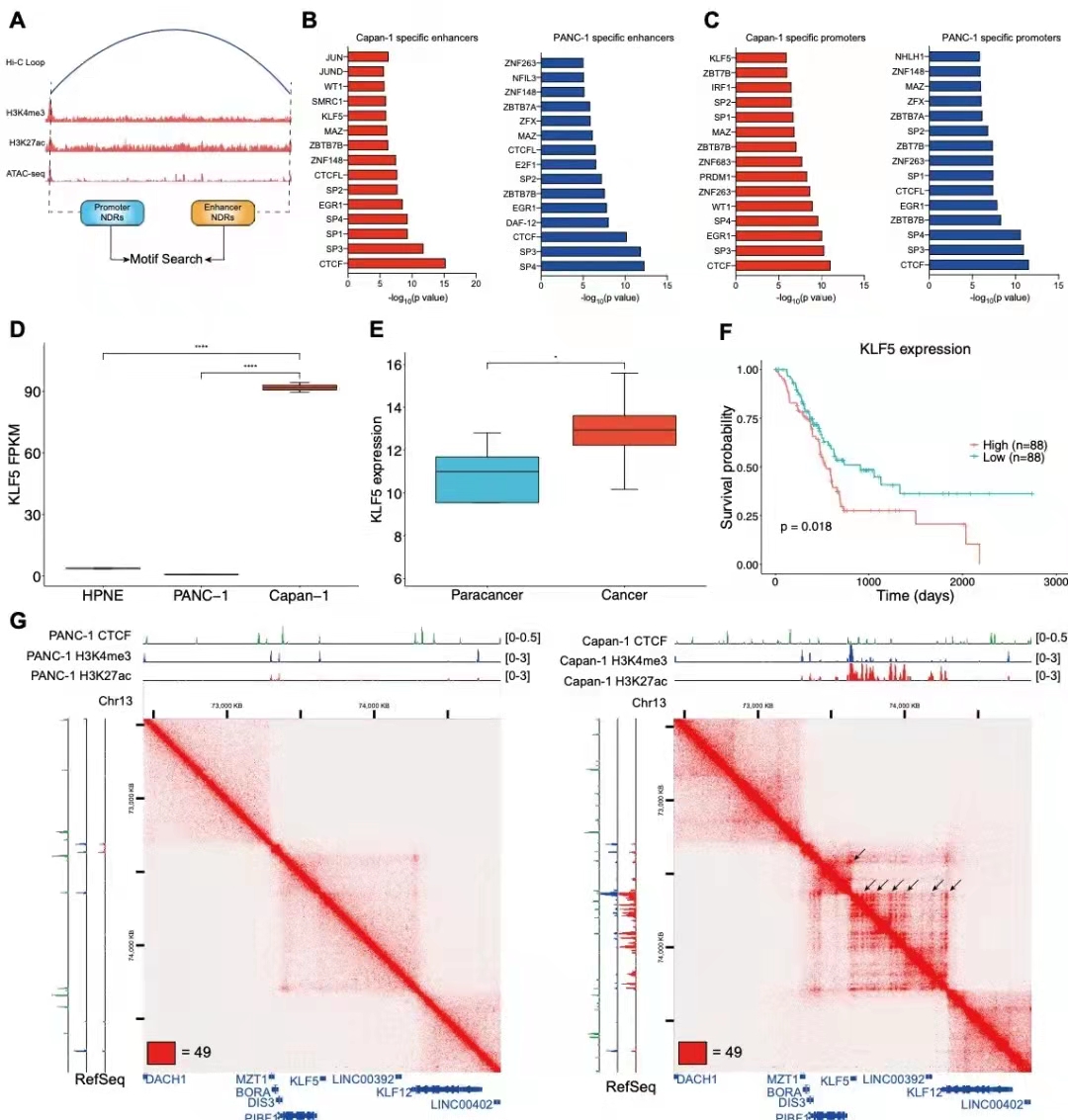 先前的研究表明KLF5對(duì)胰腺癌的進(jìn)展至關(guān)重要,而在本次研究中,KLF5的motif在轉(zhuǎn)移特異性增強(qiáng)子和相應(yīng)的啟動(dòng)子處富集(圖6b-c)。RNA-seq分析顯示KLF5在轉(zhuǎn)移癌細(xì)胞中顯著上調(diào)(圖6d)。此外,通過TCGA數(shù)據(jù)分析,發(fā)現(xiàn)胰腺癌樣本中KLF5的表達(dá)高于正常樣本(圖6e),并且KLF5的高表達(dá)與胰腺癌患者的不良預(yù)后相關(guān)(圖6f)。利用多組學(xué)數(shù)據(jù),作者確定了轉(zhuǎn)移癌細(xì)胞中KLF5啟動(dòng)子區(qū)域的特有的幾個(gè)增強(qiáng)子(圖6g,黑色箭頭)??傊?,轉(zhuǎn)移特異性增強(qiáng)子環(huán)到幾個(gè)關(guān)鍵TFs的啟動(dòng)子,這些TFs可以介導(dǎo)額外的增強(qiáng)子啟動(dòng)子成環(huán)來上調(diào)與胰腺癌轉(zhuǎn)移相關(guān)的基因。