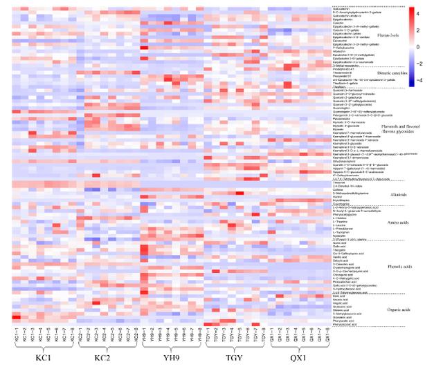 不同茶葉KC1、KC2、YH9、TGY、QX1代謝產(chǎn)物的熱圖
