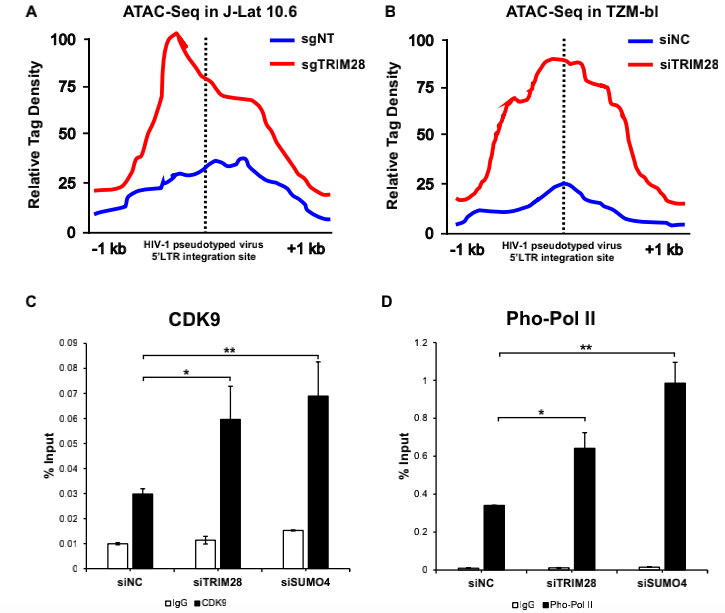ATAC-seq:J-Lat 10.6或TZM-bl細(xì)胞系,研究TRIM28缺失后HIV-1啟動(dòng)子的染色質(zhì)可及性
