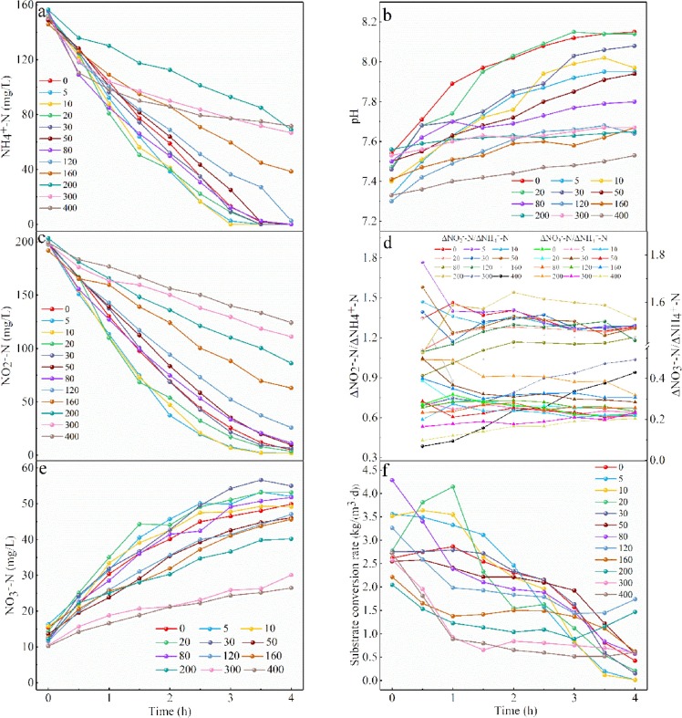 如圖3d所示,ΔNO2–N/ΔNH4+-N 和ΔNO3–N/ΔNH4+-N在前2小時(shí)出現(xiàn)不規(guī)則波動,然后趨于穩(wěn)定。然而,在300-400 mg/L時(shí),ΔNO2–N/ΔNH4+-N顯著偏離1.32,這與0-50 mg/L時(shí)的情況相反。隨著磷酸鹽濃度的增加,出水pH升高的幅度逐漸變平(圖3b),例如400 mg/L時(shí),ΔpH值僅占不添加磷酸鹽時(shí)的33%。如圖3f所示,隨著反應(yīng)時(shí)間的延長,底物轉(zhuǎn)化率逐漸降低,在160-400 mg/L階段,由于磷酸鹽沉積物的存在,底物與生物質(zhì)之間的接觸受到阻礙,導(dǎo)致底物轉(zhuǎn)化率較低。因此,在高濃度磷酸鹽的存在下,SBR 中MAB的活性會嚴(yán)重惡化。