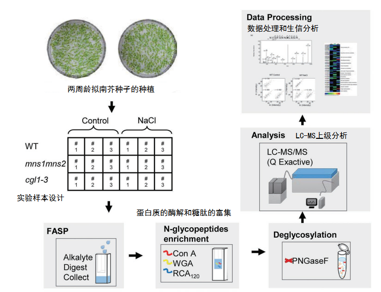 在植物中,N-糖基化參與許多生物過程,包括類固醇激素受體的?ER?質量控制、配子體識別,?亞細胞轉運,?植物先天免疫?和氣孔發(fā)育等,主要是通過調節(jié)底物蛋白的穩(wěn)定性、功能或亞定位實現(xiàn)調控過程。此外研究發(fā)現(xiàn)復雜的N-聚糖生物合成失敗會導致擬南芥幼苗對鹽敏感,但對其潛在的分子機制仍知之甚少。本文利用納升流液相色譜串聯(lián)質譜?(nanoLC-MS/MS)?技術進行了無標記蛋白質組學分析,比較分析了野生型?(WT)?和兩個抗鹽脅迫的突變體的蛋白質組差異。