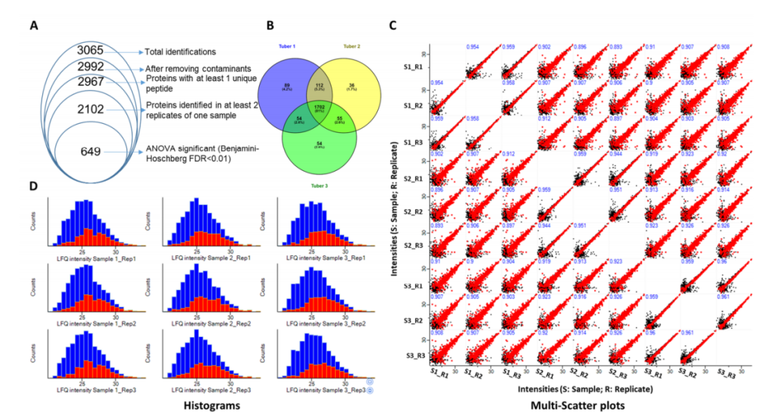 維恩圖分析顯示1702個蛋白質組通常在所有三個塊莖樣品中鑒定,而89、36和54個蛋白質組分別僅在塊莖?1、2和3中鑒定。此外,塊莖?1?和塊莖?2?共有?112?個蛋白質組,表明它們的蛋白質組與塊莖對?(2,3)?和?(3,1)?相比更密切相關(圖1?B)。為了檢查同一樣品一式三份中無標記蛋白質定量的重現(xiàn)性,使用?Perseus軟件生成多散點圖(圖1?C)。相同樣本的散點圖顯示出典型的非均勻分布,即在較低強度時較寬,在較高強度時指向較高。同一樣品的不同重復的皮爾遜相關系數(shù)大于0.944,表明同一樣品的三次重復之間具有高度相關性。直方圖顯示了缺失值插補前后的蛋白質計數(shù)?(圖1?D)。