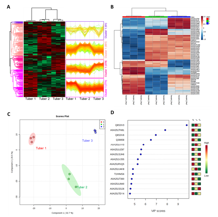 層次聚類分析將差異蛋白分成四個簇,每個簇都有不同的表達譜(圖2?A)。簇1包含61種蛋白質,在塊莖3中主要下調,而簇1的891種蛋白質主要在塊莖2中上調。簇3顯示塊莖3中豐度增加的379種蛋白質,而簇4中的771種蛋白質在塊莖?1?中顯示最大豐度。顯示前48種差異調節(jié)蛋白質豐度模式的熱圖位于?(圖2?B)。在這48個DEs中鑒定了多種具有獨特功能的蛋白質。共有19、24和34種DE蛋白受到高度調節(jié),而塊莖1-3中分別有27、22和14種蛋白質降低。結果表明,塊莖?1?和塊?3?的蛋白質含量非常不同,而塊莖2的結果則參差不齊。此外,偏最小二乘判別分析?(PLS-DA)?將成分?1?中的塊莖1和3分開,占總方差的32.7%,而成分2中的塊莖2與塊莖1和3分開,占總方差的?25.5%總方差的百分比?(圖2?C)。最后確定了有助于PLS-DA圖分離的前15種蛋白質(圖2?D)。