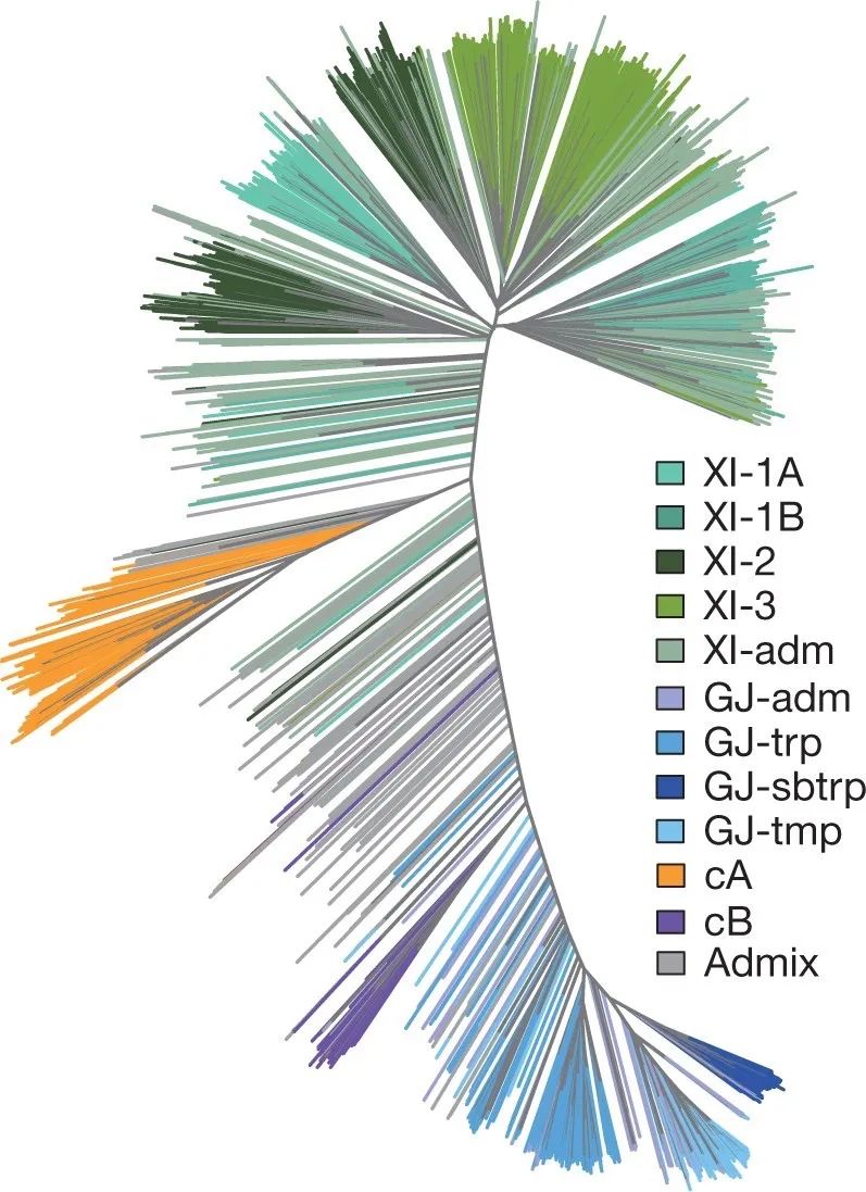 除此之外,陸續(xù)還有不少物種開展了大規(guī)模測序工作,實現(xiàn)對種質(zhì)資源基因型精準鑒定,挖掘優(yōu)異種質(zhì)和優(yōu)異基因,如西南大學團隊對588份油菜進行全基因組重測序,為油菜的起源和改良歷史提供了重要的資源;浙江大學團隊對991份油菜種質(zhì)資源全基因組重測序,揭示了油菜的演化以及不同生態(tài)型油菜開花時間分化在基因組上的足跡;中國農(nóng)業(yè)科學院作物科學研究所團隊對510份苦蕎全基因組重測序,系統(tǒng)構(gòu)建了苦蕎基因組變異圖譜;南京農(nóng)業(yè)大學團隊對312份梨樹種質(zhì)全基因組重測序,為梨樹的分子育種和基因鑒定提供了遺傳資源;國際竹藤研究中心團隊對417份竹子進行全基因組重測序,揭示了竹子種群結(jié)構(gòu)和性狀遺傳基礎;中國林業(yè)科學研究院林業(yè)研究所利用815份核桃和泡核桃材料構(gòu)建了核桃基因組變異圖譜,揭示了核桃適應性和重要農(nóng)藝性狀形成的遺傳機制。
