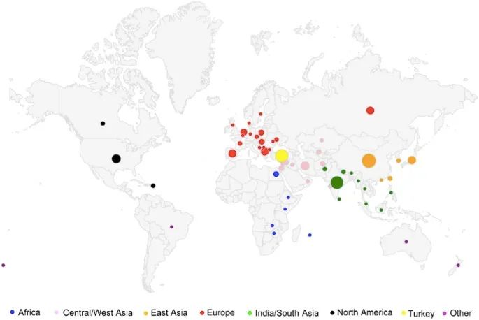 2021年8月發(fā)表在《PNAS》上的“10,038份辣椒群體基因組分析”,調(diào)查了野生和馴化辣椒的基因組多樣性和種群結(jié)構(gòu),追溯了進化路線,并提供了一個反映人類貿(mào)易和歷史/文化影響的辣椒傳播模型。本結(jié)果突出了西-東擴張路線,揭示了南美洲和中美洲、非洲以及東亞/南亞之間的聯(lián)系,后兩者構(gòu)成了辣椒多樣性的重要多樣化中心。最后,文章提出了種質(zhì)資源庫管理的思路和未來種質(zhì)資源開發(fā)利用的方向。