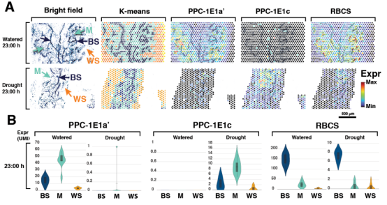1. 研究人員通過(guò)激光顯微技術(shù)對(duì)不同環(huán)境(水分充足及干旱環(huán)境,白天及夜間)葉片進(jìn)行切割區(qū)分,獲得葉肉,葉鞘及水分貯藏細(xì)胞,進(jìn)行傳統(tǒng)的轉(zhuǎn)錄組分析,并結(jié)合空間轉(zhuǎn)錄組測(cè)序及葉片的組織區(qū)分,分析了C4及CAM相關(guān)的差異表達(dá)基因,并建立了流量平衡模型,預(yù)測(cè)了干旱條件下c4 +CAM系統(tǒng)的完整性。